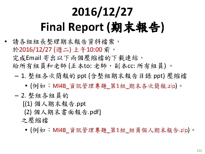 課程大綱 (Syllabus) 週次 (Week) 日期 (Date) 內容 (Subject/Topics) 1 2016/09/13 Introduction to Case Study for Information Management Hot Topics 2 2016/09/20 Information Systems in Global Business: UPS (Chap. 1) (pp. 53 -54) 3 2016/09/27 Global E-Business and Collaboration: P&G (Chap. 2) (pp. 84 -85) (Typhoon Day Off) 4 2016/10/04 Global E-Business and Collaboration: P&G (Chap. 2) (pp. 84 -85) 5 2016/10/11 Information Systems, Organization, and Strategy: Starbucks (Chap. 3) (pp. 129 -130) 2