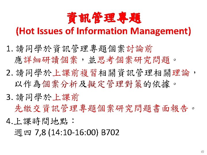 課程大綱 (Syllabus) 週次 日期 內容(Subject/Topics) 13 2017/12/14 Enterprise Applications: Summit and SAP (Chap. 9) (pp. 396 -398) 14 2017/12/21 Enterprise Applications: Summit and SAP (Chap. 9) (pp. 396 -398) 15 16 17 18 2017/12/28 2018/01/04 2018/01/11 2018/01/18 E-commerce: Zagat (Chap. 10) (pp. 443 -445) Final Report I (期末報告 I) Final Report II (期末報告 II) Final Exam Week (期末考試週) 4