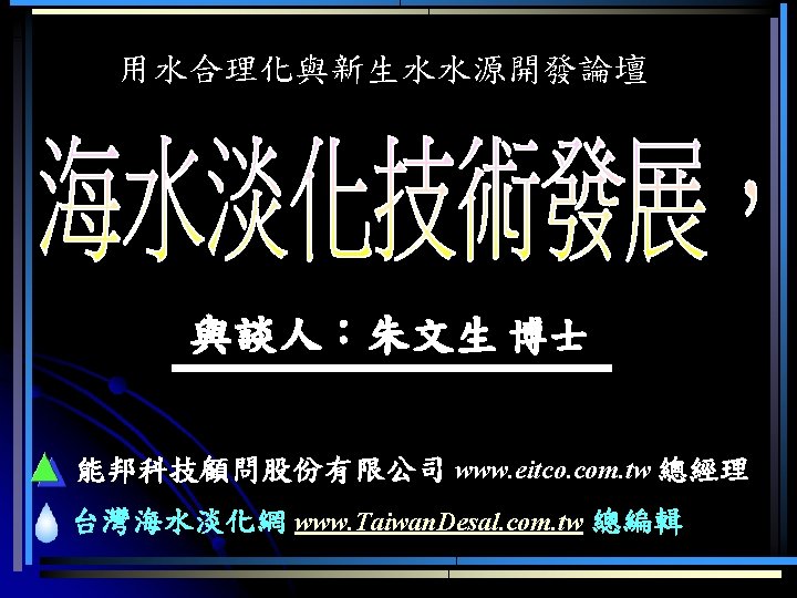 與電廠共構(共用取排水設施) 地點 Tampa Bay, FLA 產量 (CMD) 供水年份 95, 000 2007 Carlsbad, CA 200, 000 2011 Huntington Beach, CA 200, 000 2010 El Segundo, CA 76, 000 2012 Playa del Rey, CA 45, 000 2015 優點: 降低海淡興建成本 10% 溫度較高水(+5. 5℃)降低 5~10%操作壓力 可大量稀釋 (20: 1以上) 鹵水 後再排放