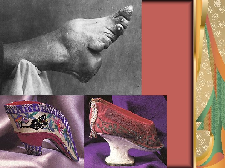 Footbinding • Originates in the palace of the last king of the Tang Dynasty • continued even when it was banned by the Manchurian Qing Dynasty (1644 -1911). • In remote mountainous areas, women still had their feet bound even when the New China was founded in 1949.