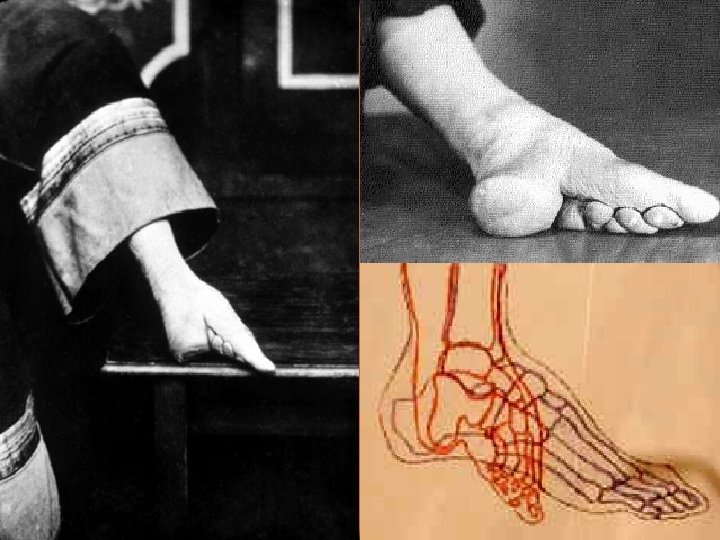 Footbinding • Originates in the palace of the last king of the Tang Dynasty • continued even when it was banned by the Manchurian Qing Dynasty (1644 -1911). • In remote mountainous areas, women still had their feet bound even when the New China was founded in 1949.