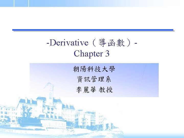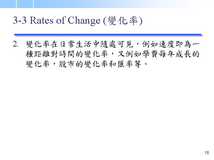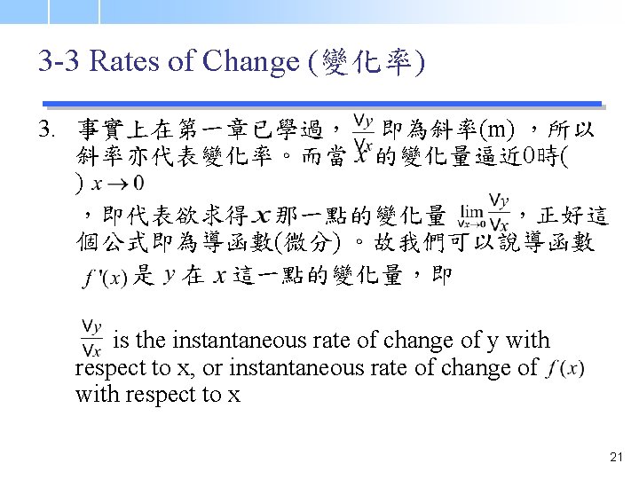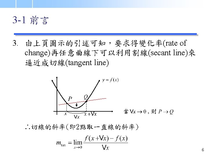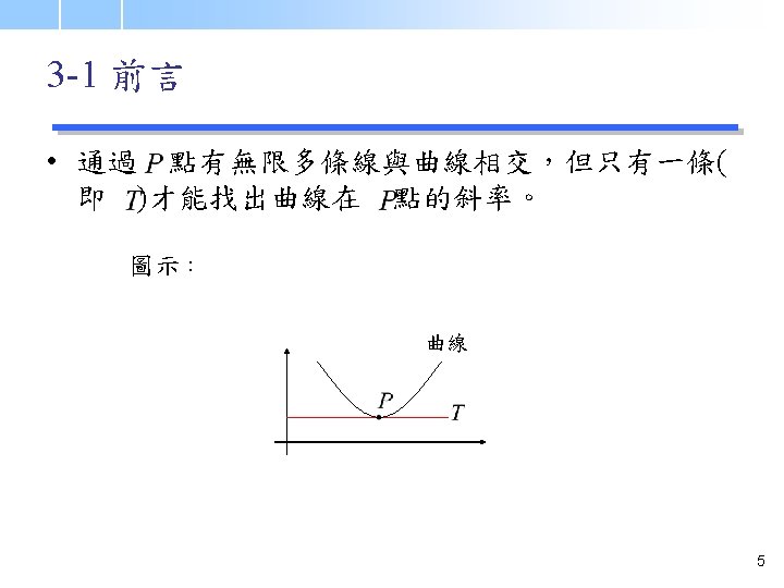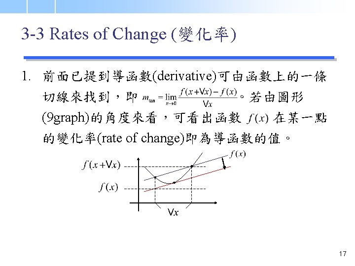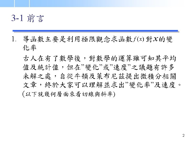 3 -1 前言 • When the derivative exists, the function is said to be differential • To differentiate a function means to determine its derivative • 有關微分的寫法及念法如下 , , , 葉布尼茲的寫法 9