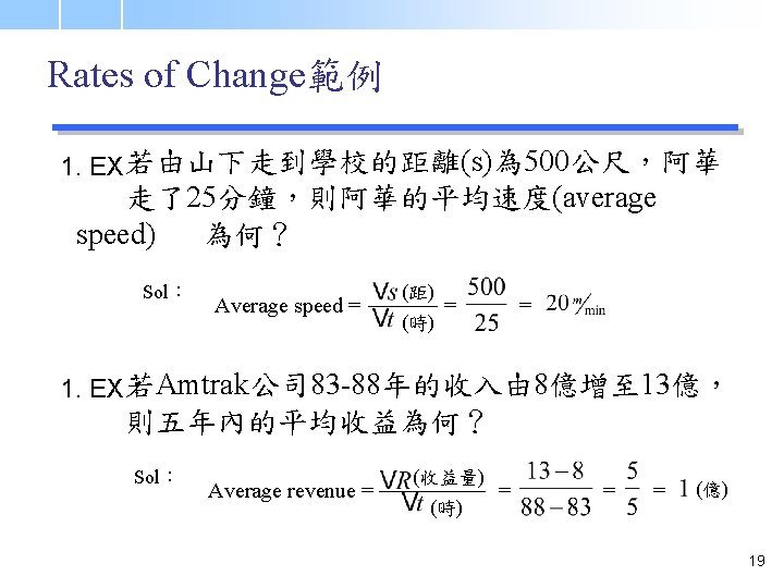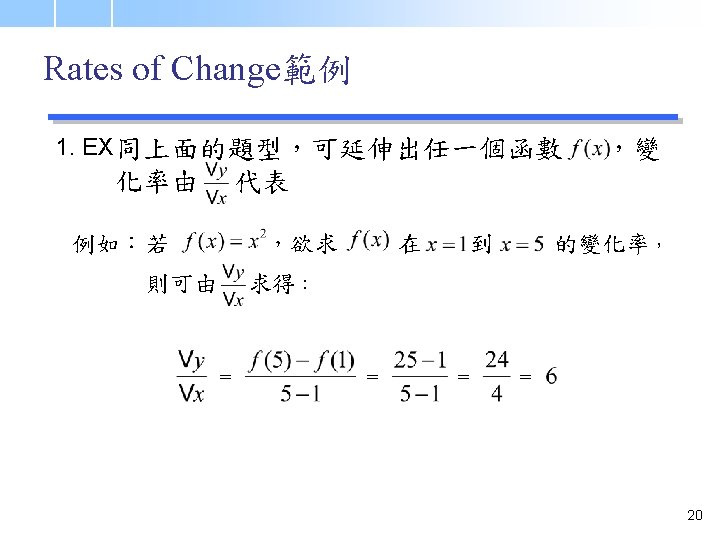Tangent Line範例 EX:Determine the slope of the line tangent to the graph of Sol: -2 -1 1 2 3 ∴當 at point (-2, 4) is 2(-2)= -4 7