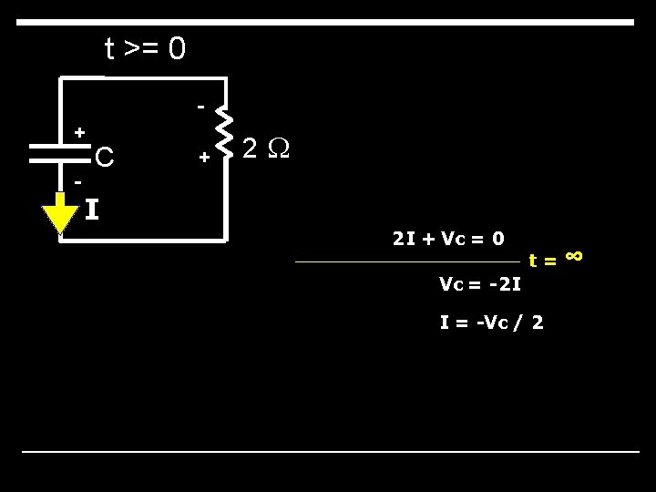t<0 t >= 0 + - + 12 V + C - I -12 + IR + Vc = 0 -12 + 0. R + Vc = 0 Vc = 12 V t=0 - C + - 2 W I 2 I + Vc = 0 t= ∞