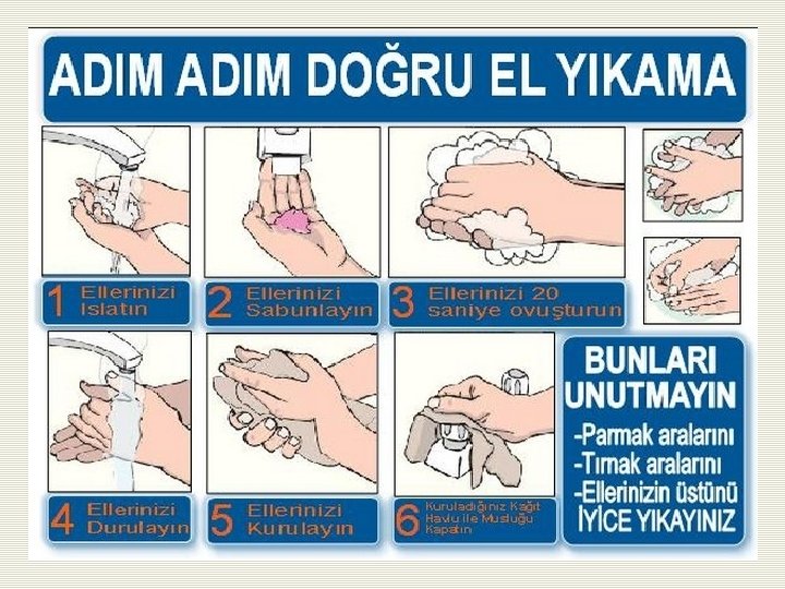 Ellerimizi; Ø bol sabun ile akan su altında Ø 20 -30 saniye kuvvetli şekilde, Øparmaklarımız ve bileklerimiz dahil ovalayarak yıkamalıyız.