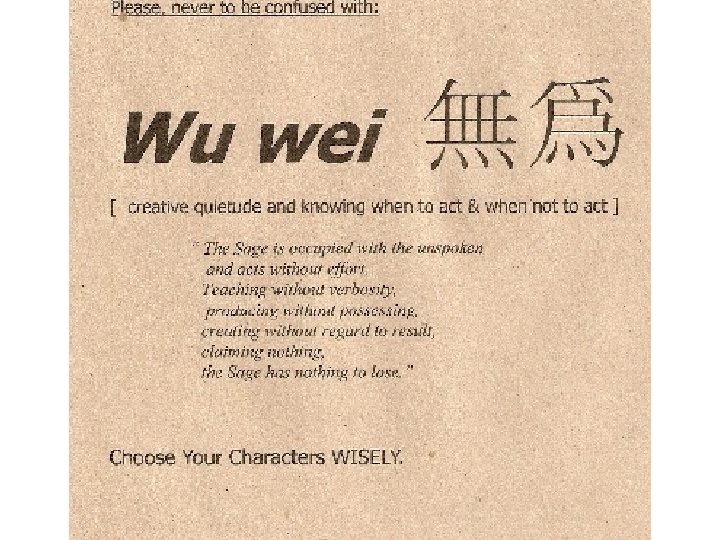 Wu Wei • Wu Wei - “without doing, causing, or making” • comes from the Chinese symbol of a clawing hand a monkey => meaning “No Monkeying Around”