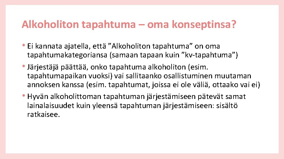 Alkoholiton tapahtuma – oma konseptinsa? • Ei kannata ajatella, että ”Alkoholiton tapahtuma” on oma tapahtumakategoriansa (samaan tapaan kuin ”kv-tapahtuma”) • Järjestäjä päättää, onko tapahtuma alkoholiton (esim. tapahtumapaikan vuoksi) vai sallitaanko osallistuminen muutaman annoksen kanssa (esim. tapahtumat, joissa ei ole väliä, ottaako vai ei) • Hyvän alkoholittoman tapahtuman järjestämiseen pätevät samat lainalaisuudet kuin yleensä tapahtuman järjestämiseen: sisältö ratkaisee.