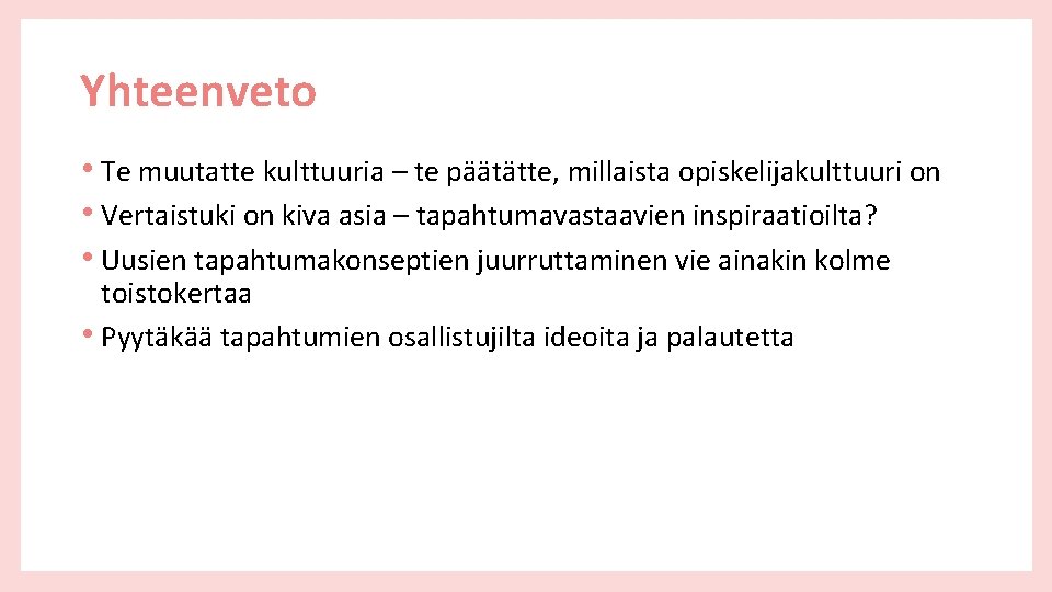 Yhteenveto • Te muutatte kulttuuria – te päätätte, millaista opiskelijakulttuuri on • Vertaistuki on kiva asia – tapahtumavastaavien inspiraatioilta? • Uusien tapahtumakonseptien juurruttaminen vie ainakin kolme toistokertaa • Pyytäkää tapahtumien osallistujilta ideoita ja palautetta