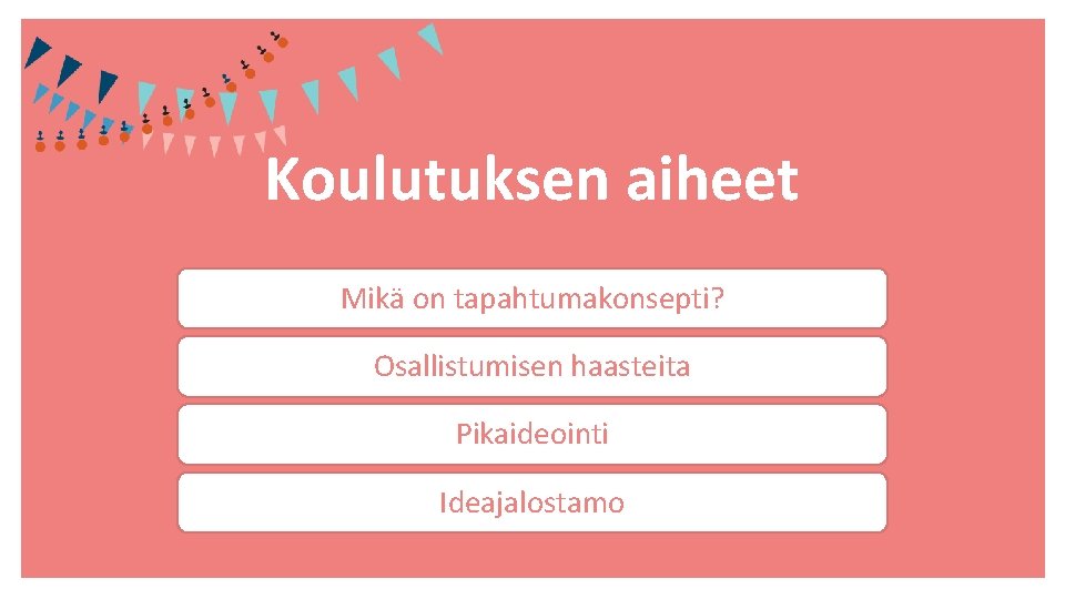 Koulutuksen aiheet Mikä on tapahtumakonsepti? Osallistumisen haasteita Pikaideointi Ideajalostamo
