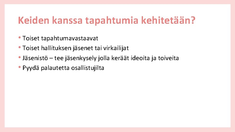 Keiden kanssa tapahtumia kehitetään? • Toiset tapahtumavastaavat • Toiset hallituksen jäsenet tai virkailijat • Jäsenistö – tee jäsenkysely jolla keräät ideoita ja toiveita • Pyydä palautetta osallistujilta