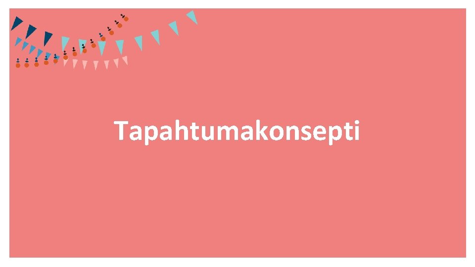 Tapahtumakonsepti • Tapahtumakonsepti = tapahtuman idea, mielikuva, rakenne, ”mitä täällä tehdään” • Tapahtumakonsepti ei ole yhtä kuin suunnitelma • Esimerkkejä: lukupiiri, piknik, sitsit, appro