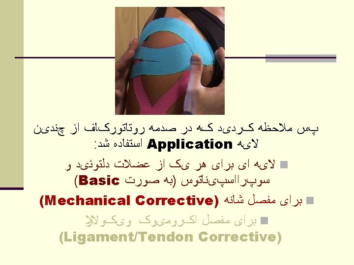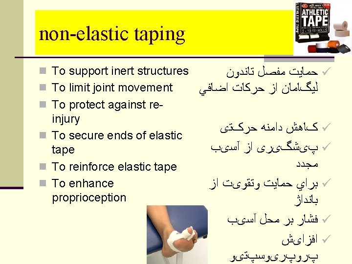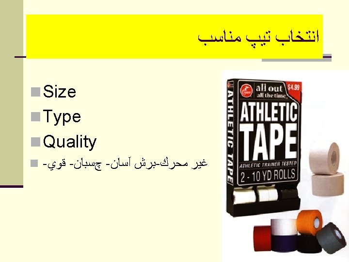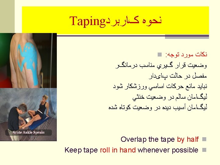 Selection considerations n Goals of taping n Diagnosis of injury(Location, Nature, Severity ) n knowledge of anatomy and biomechanics n movements that should restrict n tissues that should protect and support n Sport & position n Athletes acceptance n A taping that is effective for an athlete in one sport may not be suitable for another athlete ﻫﺪﻑ ﺍﺯ ﺗﻴپ ﻧﻮﻉ ﻭﻣﺤﻞ آﺴﻴﺐ ﺭﺷﺘﻪ ﻭﺭﺯﺷﻲ پﻮﺯﻳﺸﻦ ﻭﺭﺯﺷﻜﺎﺭ ﻣﻮﺭﺩ ﻗﺒﻮﻝ ﻭﺭﺯﺷﻜﺎﺭ