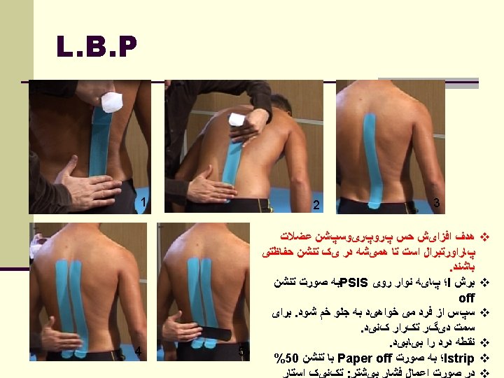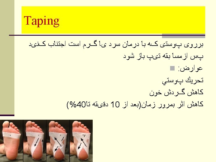 elastic taping n To compress & support soft tissue n To provide anchors around muscle thus allowing for expansion n To hold protective pads in place n Good for small, angular body parts ﺍﻋﻤﺎﻝ ﻓﺸﺎﺭ n ﻭﺣﻤﺎیﺖ ﺑﺮﺍی ﺩﻭﺭ ﻋﻀﻼﺕ n ﺑﺮﺍی ﻧگﻪ ﺩﺍﺭی n پﺪﻫﺎ ﺩﺭ ﻣﺤﻞ