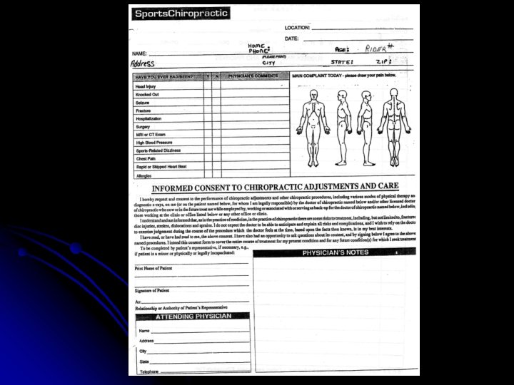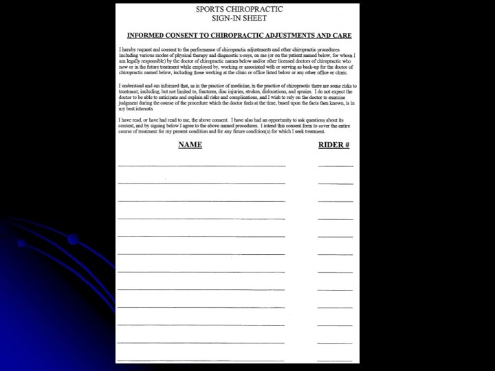 Team Chiropractor Duties can vary considerably l Referral l On site l Work with team trainer l Part of health care team l l Trainer, l team MD, dentist, ect Only health care professional