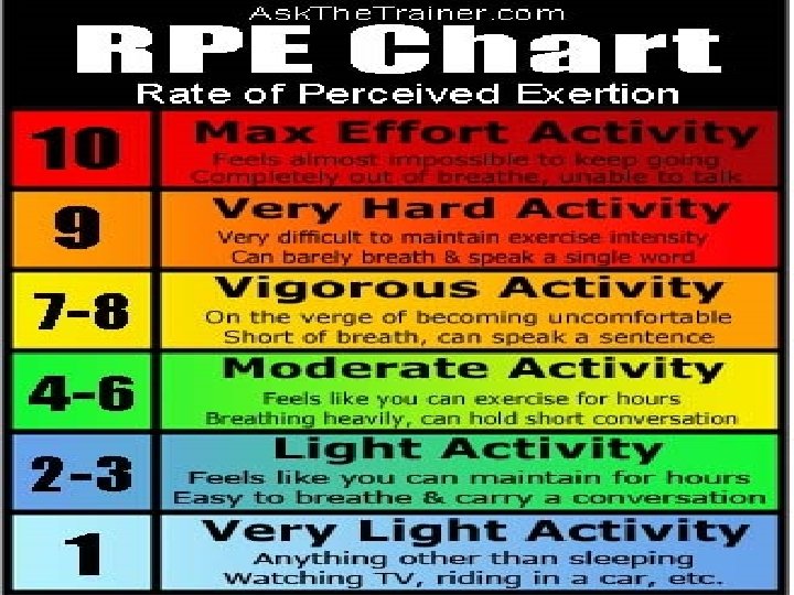 Rate of Perceived Exertion • When exercising, it's important to monitor your intensity to make sure you're working at a pace that is challenging enough to help you reach your goals, but not so hard that you blow a lung. One way to do that is to use a Perceived Exertion Scale • In general, for most workouts you want to be at around Level 5 -6. If you're doing interval training, you want your recovery to be around a 4 -5 and your intensity blasts to be at around 8 -9.