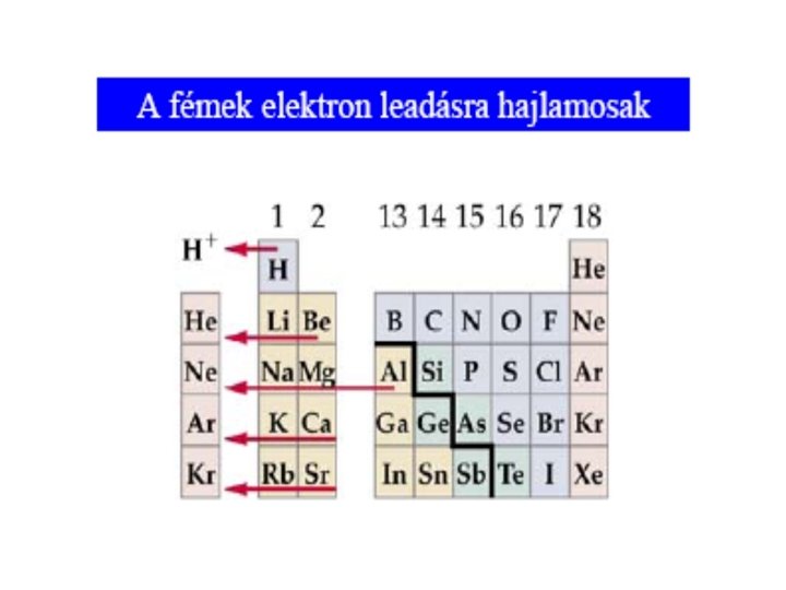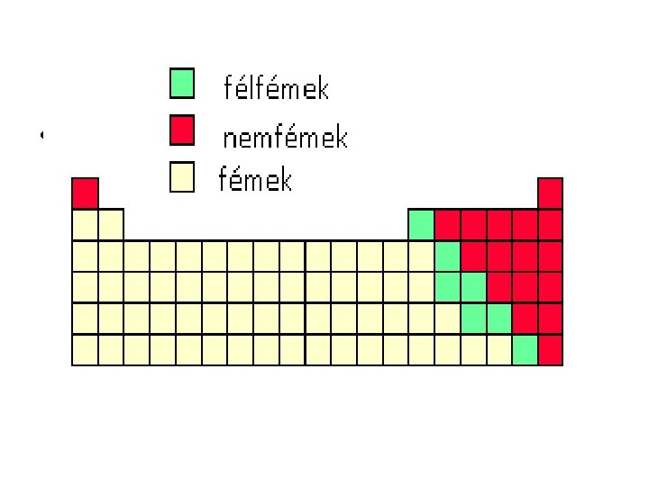 fémek • Halmazállapot: Szilárdak kivétel Hg • Hő- és elektromos vezetőképesség: Jól vezetik a hőt és elektromos áramot • Szürke fényes szín • Alakíthatóak • Mérsékelt-magas olvadáspont