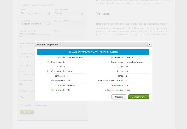 ¿Qué es Stima? Stima es un servicio a través del cual podrá conocer al instante una estimación del valor de una vivienda, rellenando un sencillo formulario. La estimación se obtiene mediante un proceso estadístico con datos de la zona en la que se ubica el inmueble. ¿Para qué sirve una estimación de valor? Para disponer del valor aproximado de una vivienda. Le orientará sobre el valor de compra o de venta apropiado. ¿Qué diferencia a Stima de otros servicios similares? La estimación se realiza sobre la base de datos de tasaciones de viviendas realizadas por Tinsa, a diferencia de otros servicios que lo hacen basándose en las ofertas publicadas de viviendas, que, en un momento como el actual, suelen diferir del valor real del inmueble. Incluso le permitirá determinar un valor justo de alquiler. Ver ejemplo de Stima Pro, el análisis más completo Si además desea información sobre el entorno que rodea a la vivienda que le interesa, su producto es Stima Pro. Conocerá si dicha vivienda es más o menos cara en comparación con las de la zona en que se ubica, así como la evolución del valor a lo largo de los últimos años. Ver ejemplo de Stima pro 2