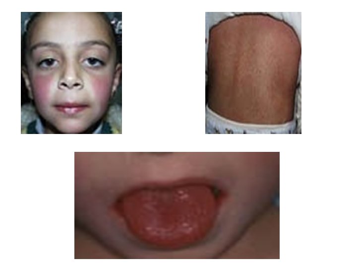 • The rash - finely punctate erythema on the superior trunk and face two to three days after the onset of illness spreading to the extremities.