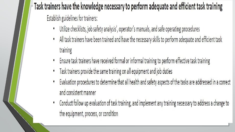 How do you prepare for task training? • Select someone to do the training who is qualified or experienced in the task. • Provide written instructions as supporting material for the training.