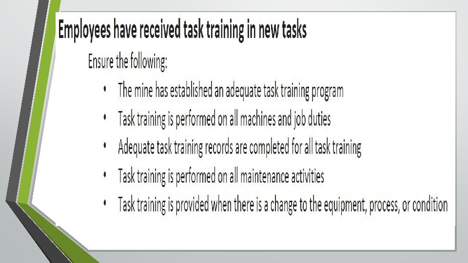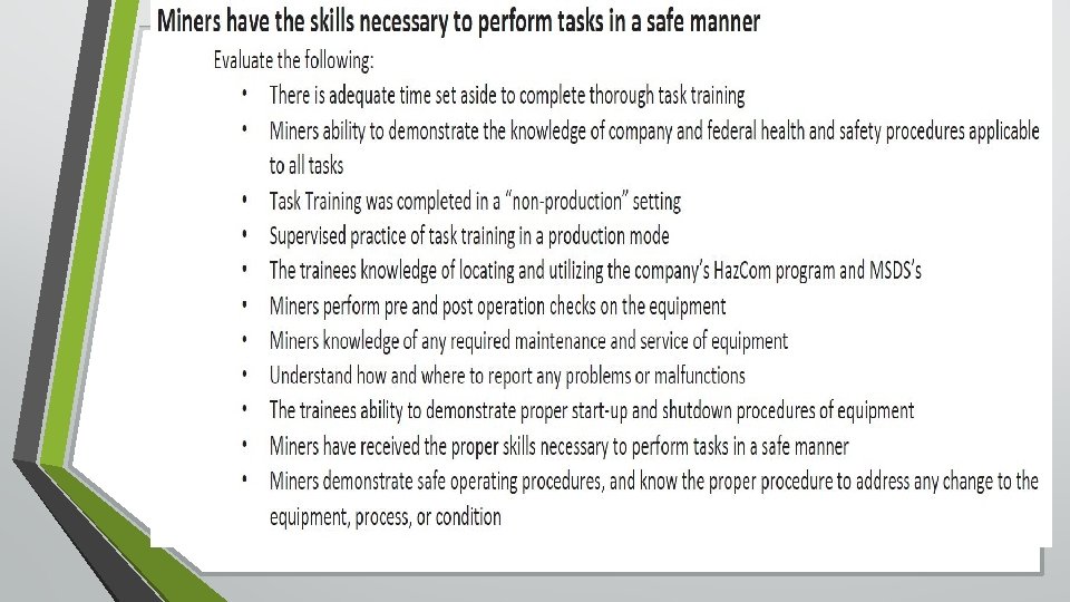 What is required in task training? (48. 7 and 48. 27) • Health and safety aspects and safe operating procedures for work tasks, equipment and machinery • Supervised practice during nonproduction • Supervised operation during production • Safe operating procedures for new or modified machines and equipment • Any other training required by the MSHA