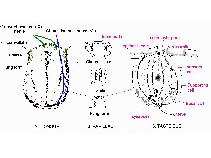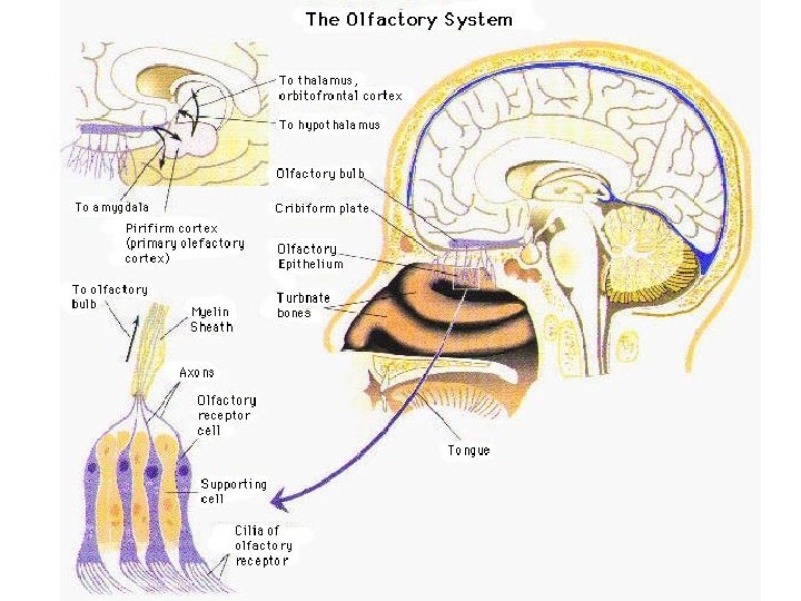Flavors vs. smells • Taste buds can detect ~ 5 basic flavors – Sweet, sour, bitter, salty, astringent, umami – About 4 -10 K taste buds on tongue, cheek, pharynx, epiglottis – Bumps called papillae • Olfactory system can percieve thousands of different chemicals