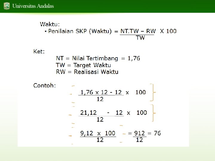 c. Aspek waktu 1) Jika kegiatan tidak dilakukan maka realisasi waktu 0 (nol) 1, 76 x Target Waktu (TW) – Realisasi Waktu (RW) x 0 x 100 Target Waktu (TW) 2) Jika aspek waktu yang tingkat efisiensinya ≤ 24% diberikan nilai baik sampai dengan sangat baik: 1, 76 x Target Waktu (TW) – Realisasi Waktu (RW) x 100 Target Waktu (TW) 3) Jika aspek waktu yang tingkat efisiensinya > 24% diberikan nilai cukup sampai dengan buruk : 76 - 1, 76 x Target Waktu (TW) – Realisasi Waktu (RW) x 100 -100 Target Waktu (TW)