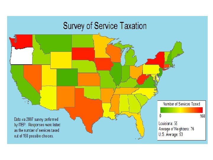 Louisiana’s Taxation of Services Louisiana Revised Statute 47: 3014 the furnishing of sleeping rooms by hotels the furnishing of printing and over printing the furnishing of cold storage space and the preparation of property for such storage the furnishing of telecommunications services the furnishing of storage or parking privileges by auto hotels and parking lots the sale of admissions to places of amusement and to athletic and recreational events, and the furnishing of privileges of access to amusement, entertainment, athletic, or recreational facilities the furnishing of laundry, cleaning, pressing, and dyeing services the furnishing of repairs to tangible personal property