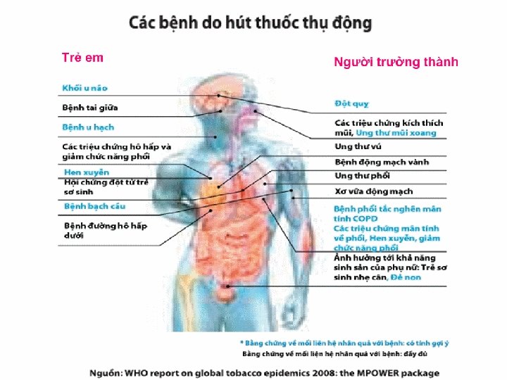 ẢNH HƯỞNG CỦA HÚT THUỐC THỤ ĐỘNG VỚI BÀ MẸ VÀ TRẺ EM § Khói thuốc thụ động làm tăng 22% nguy cơ trẻ sinh nhẹ cân (dưới 2500 g) (Leonardi-Bee JA et al, 2008). § Ở trẻ em, hút thuốc thụ động gây viêm đường hô hấp, viêm tai giữa, làm nặng thêm các triệu chứng hen và là một trong những nguyên nhân gây đột tử ở trẻ sơ sinh.