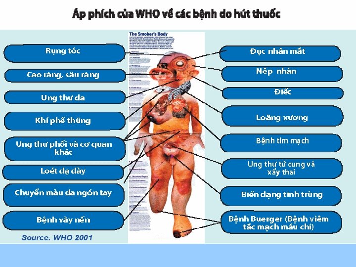 HÚT THUỐC VÀ BỆNH HÔ HẤP Bệnh phổi tắc nghẽn mạn tính Theo WHO, trên thế giới năm 2001 có khoảng 600 triệu người mắc BPTNMT. Bệnh tiến triển kéo dài trong nhiều năm và cuối cùng dẫn đến tâm phế mạn và tử vong. Bệnh phổi tắc nghẽn mạn tính là nguyên nhân tử vong đứng hàng thứ 4 trên toàn thế giới. Mối liên quan giữa bệnh phổi tắc nghẽn mạn tính và hút thuốc cũng mạnh như với ung thư phổi. Thuốc lá là nguyên nhân quan trọng nhất gây ra BPTNMT