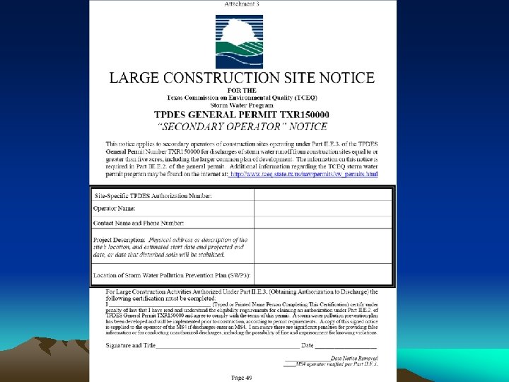 Municipal Separate Storm Sewer System Notification Requirements Part II-Sec E(1 -3) • Primary Operator - Copy of NOI supplied to MS 4 in which they discharge • Primary & Secondary Operator – Copy of TCEQ site notice