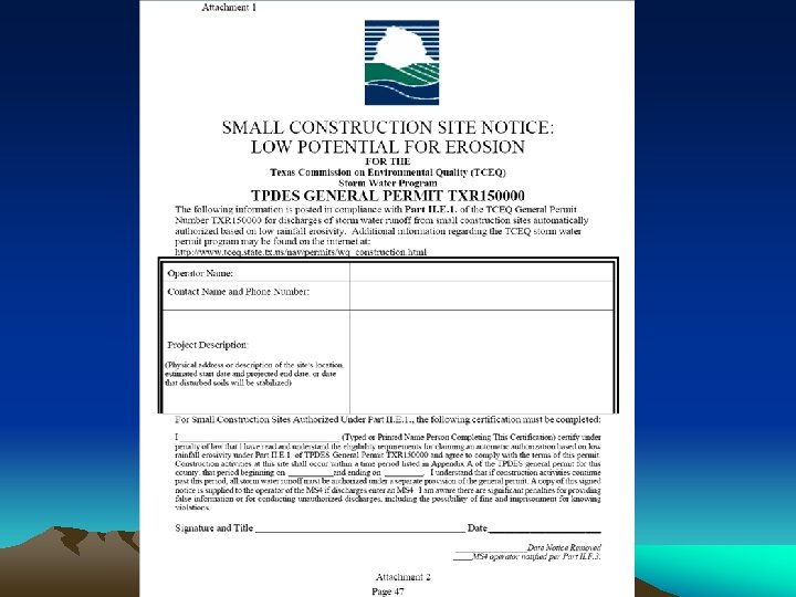 Authorization to Discharge Posting Requirements Part II-Sec E(1 -3) • Primary Operator – Large site • NOI • Construction Site Notice (Attachment 4) – Small Site • Construction Site Notice (Attachment 2) • Secondary Operator – Construction Site Notice, Large Site (Attachment 3) – Construction Site Notice, Small Site (Attachment 2)