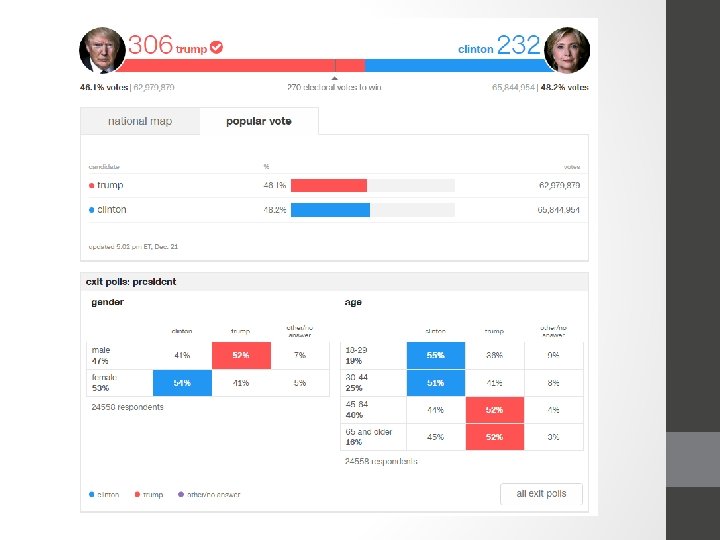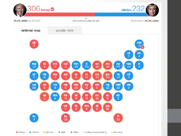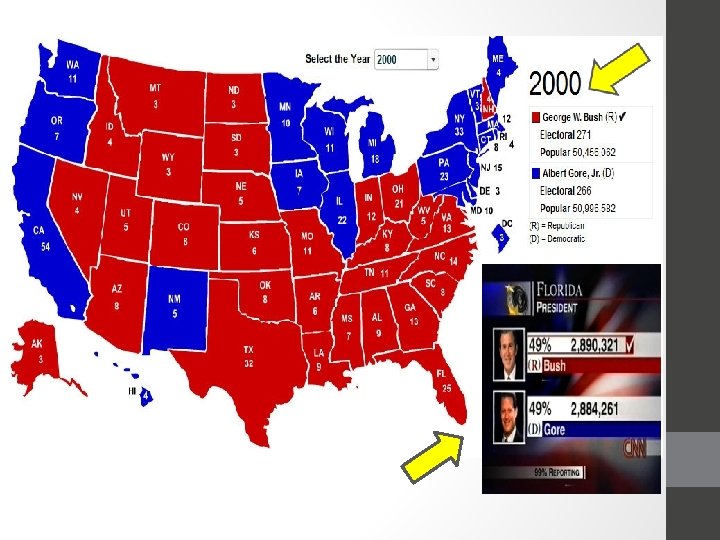 Today… • We still use the Electoral College • The Prez & V. P. are officially elected by a large group of delegates that meet every summer prior to the November election. • The delegates vote for the candidate that won the popular vote (the most votes) in their state • So, it is true, and it has happened…. this year • That a candidate could win the most votes from the people, but if they don’t win the most electoral votes they could lose the election • Cue 2000 election of Bush v. Gore (271, 266)