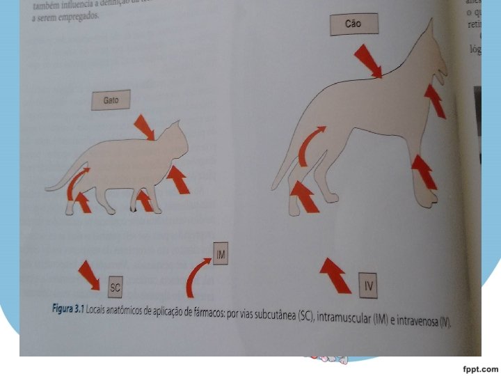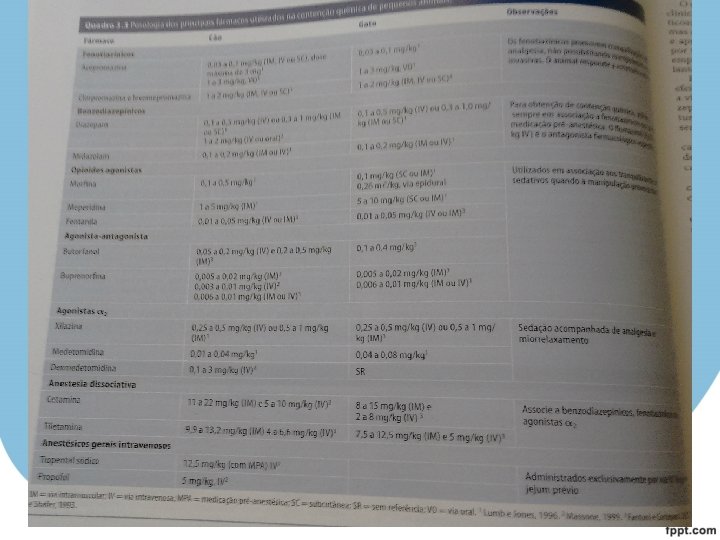 Contenção química: vias de aplicação - Via Oral: não invasivo, mas efeito variável e perído de latência longo - Pode ser utilizado em associação a contenção física - Via Tópica - Via Subcutânea (SC): efeito pode ser retardado - Via Intramuscular (IM): animais agressivos - Via Intravenosa (IV): período de latência curto
