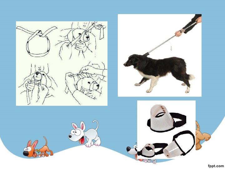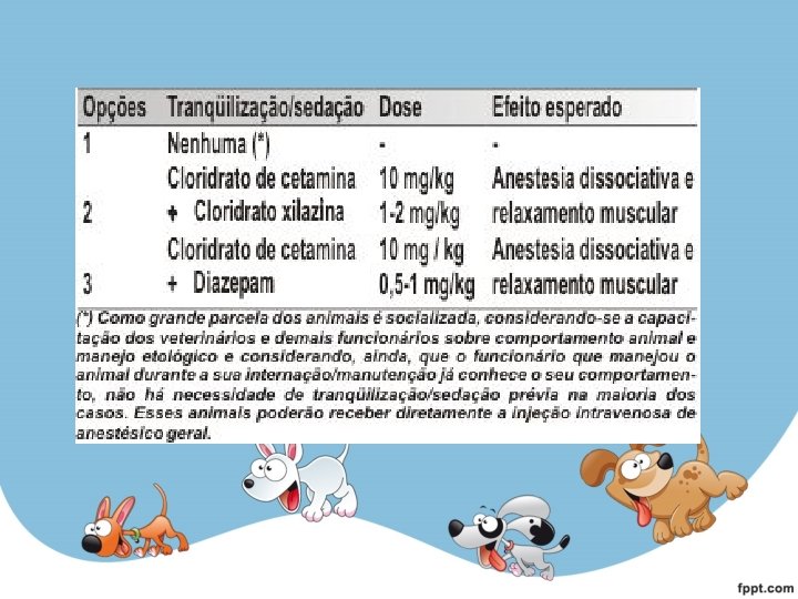 Contenção física: Cães - Pequenos ou médios: sobre a mesa, decúbito lateral - Grandes: o chão ; posição quadrupedal - Mordaça ou focinheira - Cambão