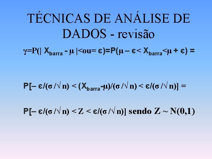 TÉCNICAS DE ANÁLISE DE DADOS - revisão • Seja P(є) = γ, a probabilidade do intervalo: [µ – є; µ + є] conter a média amostral Xbarra numa distância de, no máximo є, da média populacional µ (desconhecida), ou seja, γ=P(| Xbarra - µ |<ou= є)=P(µ – є< Xbarra<µ + є)