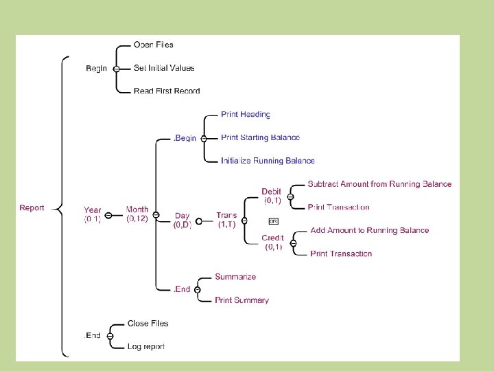 Warnier Orr Es una técnica que utiliza una representación semejante a la de cuadros sinópticos para mostrar el funcionamiento y organización de los elementos que conforman el algoritmo. Los diagramas Warnier Orr son útiles porque son compatibles con las técnicas de programación estructurada ; y además, son fáciles de desarrollar. Los diagramas Warnier Orr son fáciles de leer y modificar y no tienen que completarse antes de ser útiles. Se van desarrollando hacia otras salidas del sistema. Básicamente, utiliza una notación de llaves para organizar los módulos y se auxilia en la siguiente simbología para indicar operaciones de control.