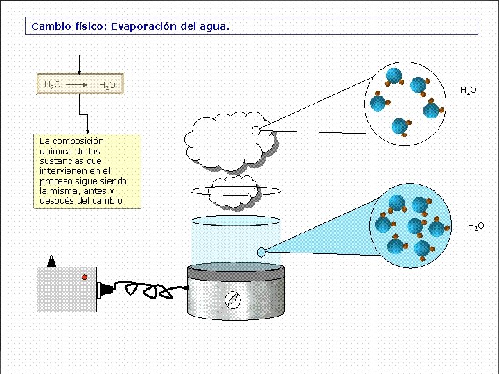 � EVAPORACIÓN: es un proceso EVAPORACIÓN: físico que consiste en el paso lento y gradual de un estado liquido hacia un estado gaseoso, tras haber adquirido suficiente energía para vencer la tensión superficial. Es la separación de un sólido disuelto en un líquido, por calentamiento, hasta que hierve y se transforma en vapor. Como no todas las sustancias se evaporan con la misma rapidez, el sólido disuelto se obtiene en forma pura.