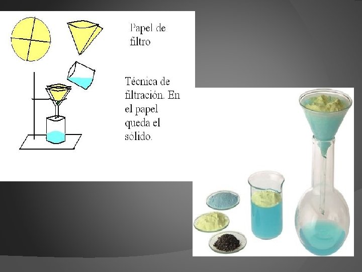 FILTRACIÓN: Es un tipo de separación mecánica, FILTRACIÓN: que sirve para separar sólidos insolubles de grano fino de un líquido en el cual se encuentran mezclados; este método consiste en verter la mezcla a través de un medio poroso que deje pasar el líquido y retenga el sólido. Los aparatos usados se llaman filtros; el más común es el de porcelana porosa, usado en los hogares para purificar el agua. Los medios más porosos mas usados son: el papel filtro, la fibra de vidrio o asbesto, telas etc. En el laboratorio se usa el papel filtro, que se coloca en forma de cono en un embudo de vidrio, a través del cual se hace pasar la mezcla, reteniendo el filtro la parte sólida y dejando pasar el líquido. Esta técnica se fundamenta en que sus componentes deben ser uno sólido y el otro líquido. Para separar estos componentes se pasa la mezcla por un papel de filtro y de esta manera el sólido quedará en el papel y el líquido lo traspasará. �