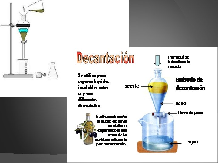� · Decantación: Es la separación mecánica de un sólido de grano grueso, insoluble, en un líquido Es la separación de un sólido insoluble del líquido, vertiendo el líquido después de sedimentar el sólido. Se emplea para separar un sólido de un líquido. En el laboratorio se utiliza el embudo de decantación. En los hogares se desarrolla este método de forma cotidiana; por ejemplo: cuando alguien está enfermo y el doctor le indica que debe tomar caldo de pollo desgrasado; por decantación se quita con una cuchara la grasa que flota en el caldo, hasta obtener un producto sin grasa. También cuando a los frijoles se les coloca en una olla con agua, la basura y las semillas en mal estado flotarán, en tanto que los útiles se van al fondo. A través de la decantación se logra separarlos.