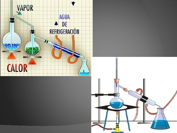 � Destilación. Es el proceso mediante el cual se efectúa la separación de dos o más líquidos miscibles y consiste en un a evaporación y condensación sucesivas, aprovechando los diferentes puntos de ebullición de cada uno de los líquidos, también se emplea para purificar un liquido eliminando sus impurezas. En la industria, la destilación se efectúa por medio de alambiques, que constan de caldera o retorta, el refrigerante en forma de serpentín y el recolector; mediante este procedimiento se obtiene el agua destilada o bidestilada, usada en las ámpulas o ampolletas que se usan para preparar las suspensiones de los antibióticos, así como el agua destilada para las planchas de vapor; también de esta manera se obtiene la purificación del alcohol, la destilación del petróleo, etc.
