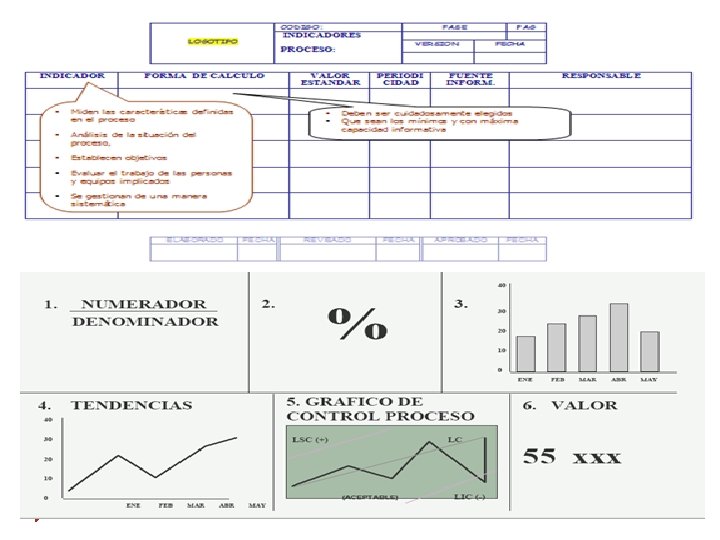 Pasos para el establecimiento de un indicador MISION (Saber que hace) • Para el establecimiento de un buen indicador lo primero es tener, bien definido el proceso. Que medir Que se quiere saber • La definición de las características mas criticas del proceso nos indican que medir y los tipos de resultados que nos orientan de que manera el proceso se dirige a su propósito. Establecer Indicadores • Una vez que están claros los tipos de resultados a medir se determinan y se establece la forma de calculo de los indicadores a emplear. Resultados esperados • Planificar y consensuar que resultados se deben alcanzar (OBJETIVOS). • Especificar el plazo de tiempo para obtener dicho resultado. • Cuando y como se hace la medición y el seguimiento… • Buscar comparaciones externas. Soporte • Establecer un formato adecuado de ficha del indicador, para facilitar el manejo de la información que nos suministra. • Establecer la forma de representarlo.