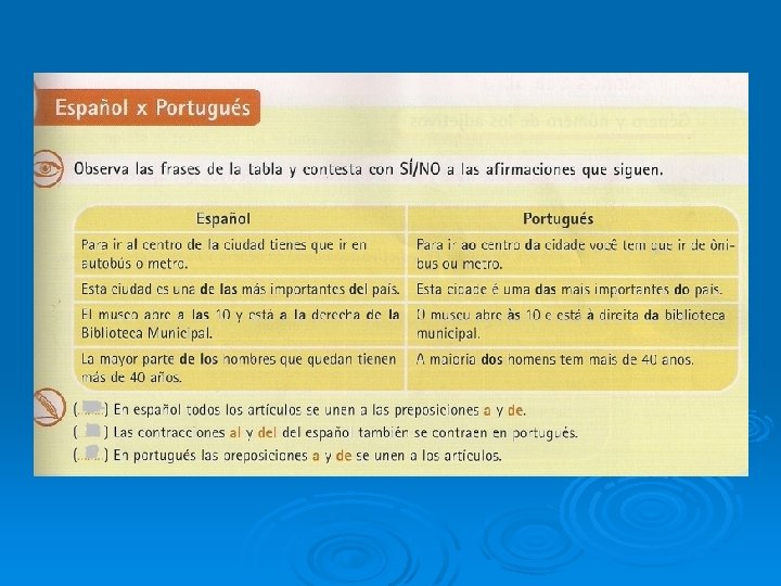 PARA FINALIZAR ALGUNAS PREGUNTAS QUE NOS DEBEMOS HACER -¿Ya le hemos preguntado a nuestros alumnos por qué ellos dicen o escriben algo de esa forma, cuando detectamos que hay algo mal? - ¿Comparamos lado a lado las construcciones de más dificultad y tratamos de entender por qué son diferentes? - ¿Le pasamos la responsabilidad por el aprendizaje a nuestros alumnos lusohablantes? - ¿Los escuchamos suficientemente? - ¿Trabajamos la comprensión y producción oral de forma suficiente? - ¿Usamos enfoques inductivos para enseñanza de la gramática cuando ellos son aconsejables? - ¿Les damos suficientes ejemplos en la lengua meta? - ¿Usamos un enfoque en espiral en la presentación de los contenidos? - ¿Estimulamos la lectura extensiva variada? -¿Estimulamos la comprensión oral global? - Estimulamos la producción. - ¿Ya te has comprado una buena gramática contrastiva?