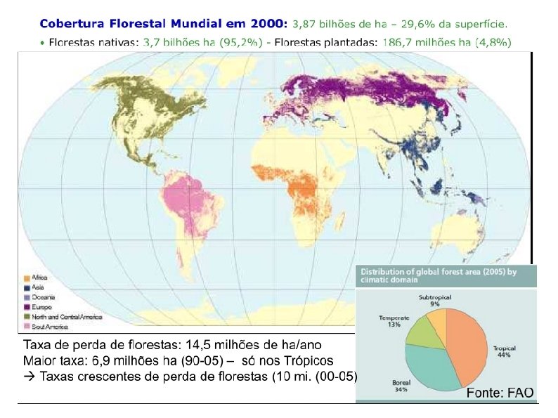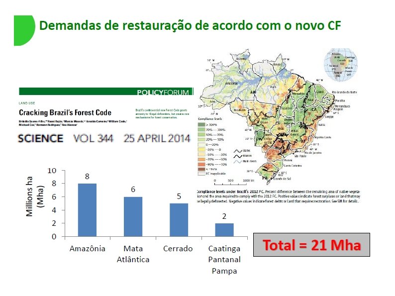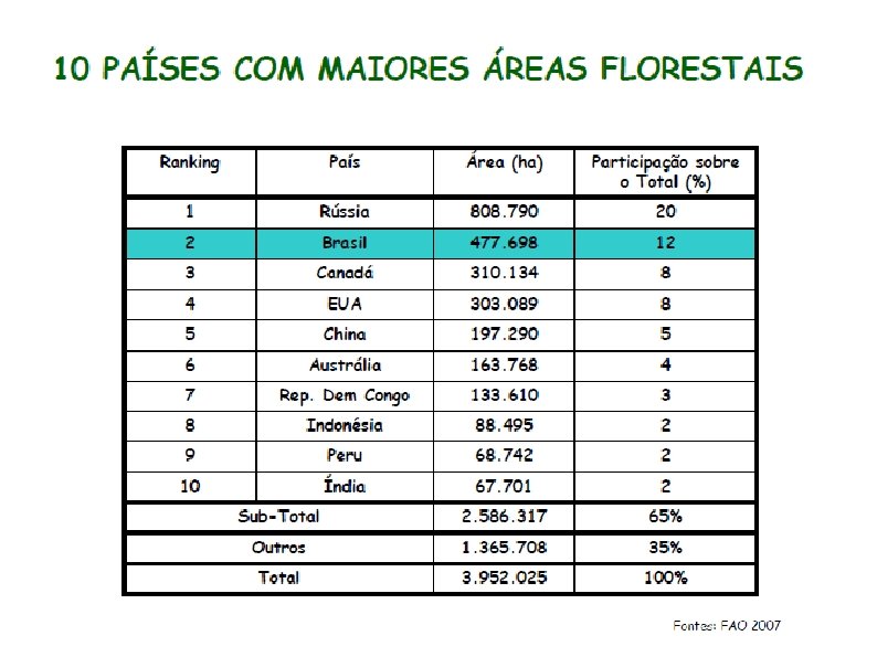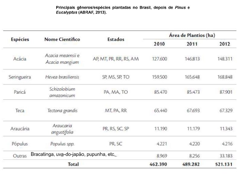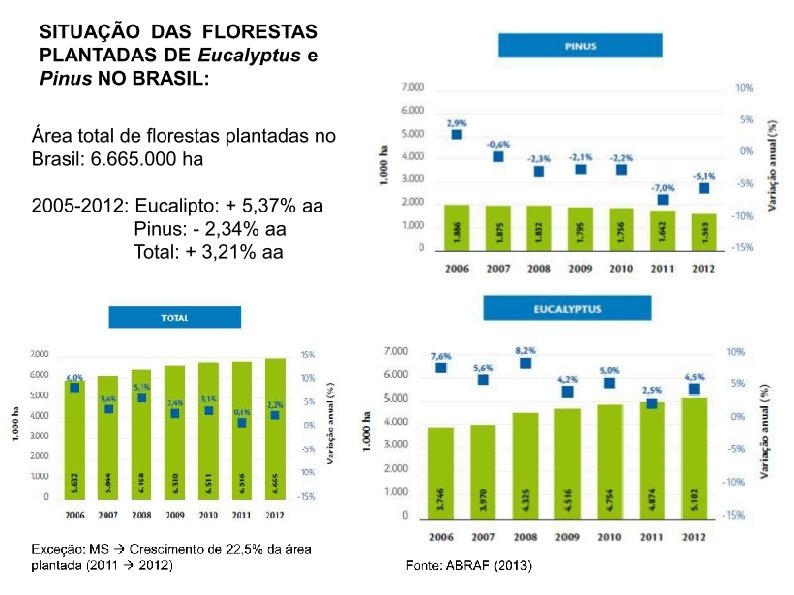 Área de Floresta Plantada brasileira Segundo relatório estatístico ABRAF 2013 ano base 2012, embora a área de Floresta Plantada no Brasil tenha aumentado significativamente nos últimos anos, o país ainda apresenta um percentual baixo sobre a área total, se comparado a outros países. Eucalipto e Pinus são as espécies dominantes no plantio florestal brasileiro. Esses dois cultivos, nos últimos anos, atingiram mais de 6 milhões de hectares, crescendo em relação ao anterior.