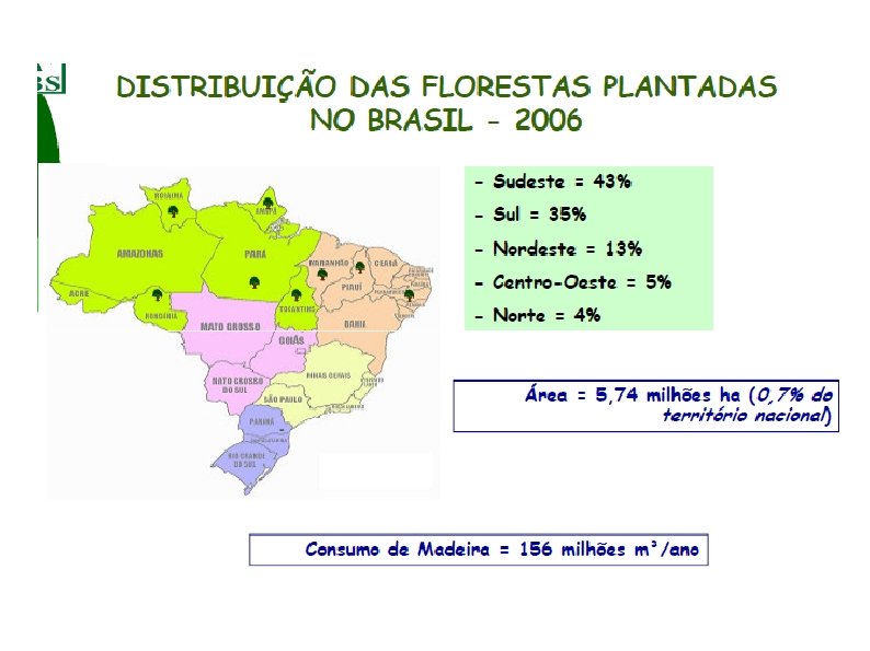 Os Estados com maior concentração de plantios florestais foram Minas Gerais, São Paulo, Paraná , Santa Catarina, Bahia e Mato Grosso do Sul.