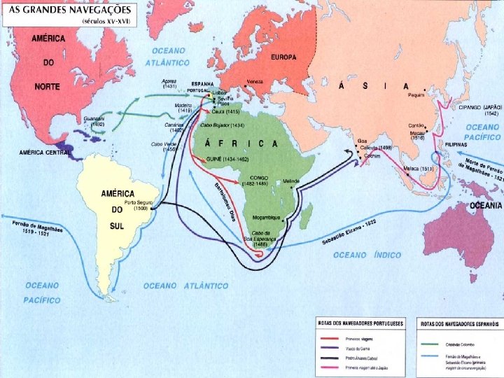 FATORES QUE CONTRIBUÍRAM PARA A EXPANSÃO MARÍTIMA PORTUGUESA • Posição geográfica do país, extremamente favorável, às navegações, já que Portugal, banhado pelas águas do Atlântico, era o reino mais ocidental da Europa; • A existência de um poder centralizado e de um Estado unificado, sem dimensões internas; • Longa experiência de pescadores e marinheiros lusitanos na costa do Atlântico; • Uma burguesia aliada ao rei, disposta a investir no comércio marítimo.