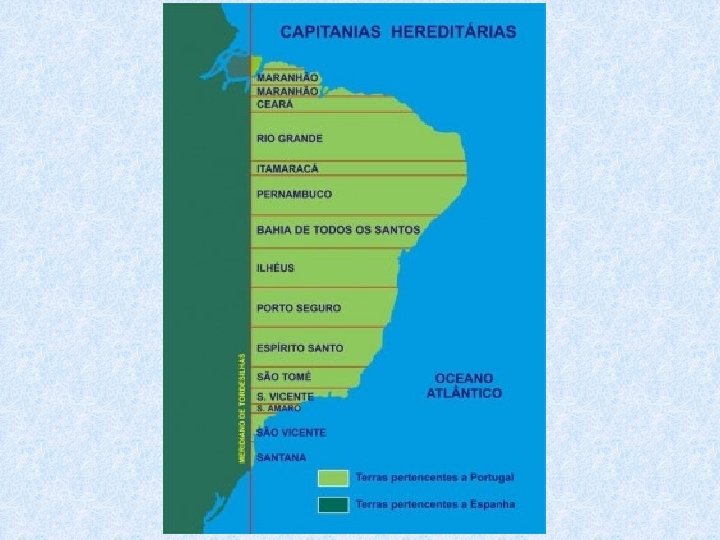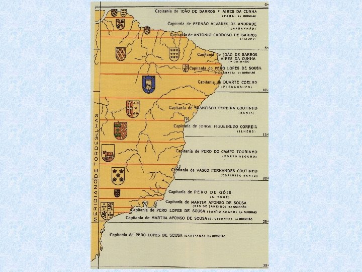 AS CAPITANIAS HEREDITÁRIAS O rei D. João III ("O Colonizador") instituiu este regime, em 1534, graças à influência de Diogo de Gouveia. Nosso país foi dividido em lotes de terras ("Capitanias"), doadas a Capitães (Donatários); começavam no litoral indo até o meridiano de Tordesilhas.