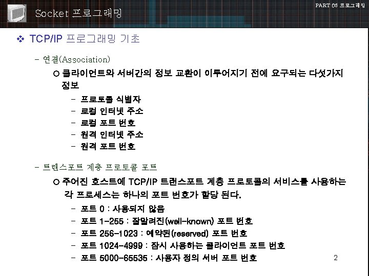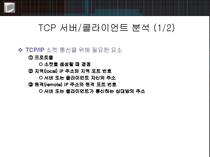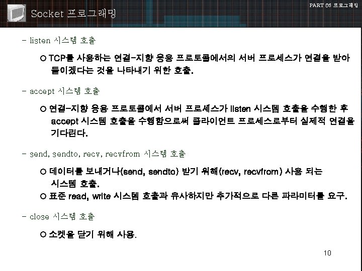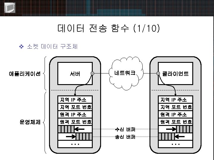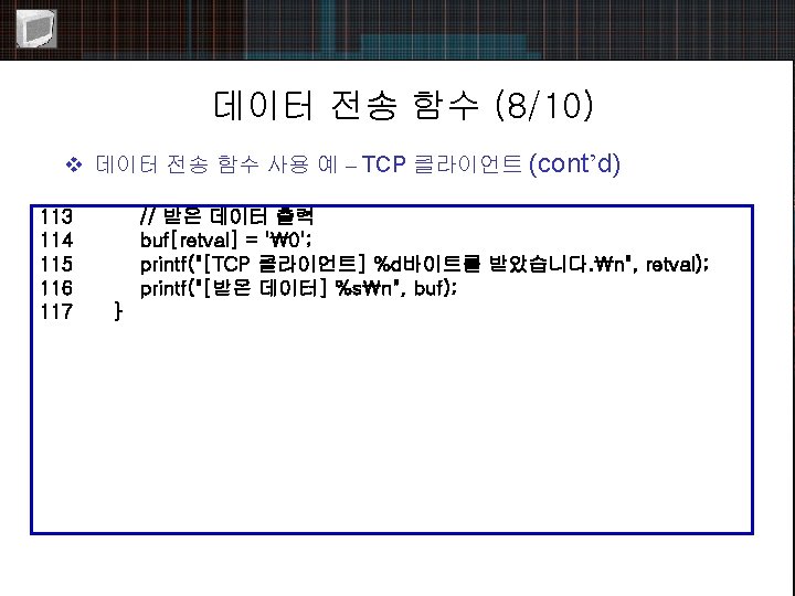 TCP 서버 함수 (8/8) v accept() 함수 사용 예 (cont’d) 076 077 078 079 080. . . 101 102 103 104 105 106 107 printf("n[TCP 서버] 클라이언트 접속: IP 주소=%s, 포트 번호=%dn", inet_ntoa(clientaddr. sin_addr), ntohs(clientaddr. sin_port)); // 클라이언트와 데이터 통신 while(1){ } // closesocket() closesocket(client_sock); printf("[TCP 서버] 클라이언트 종료: IP 주소=%s, 포트 번호=%dn", inet_ntoa(clientaddr. sin_addr), ntohs(clientaddr. sin_port)); }