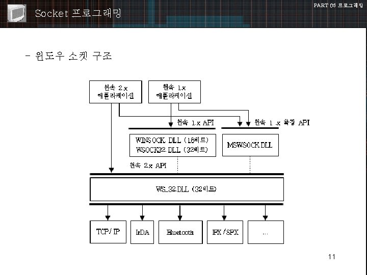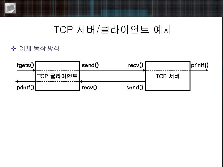 TCP 서버 함수 (1/8) v TCP 서버 함수 TCP 서버 TCP 클라이언트 socket() bind() listen() accept() recv() connect() 네트워크 send() recv() closesocket()