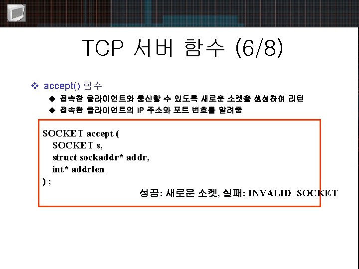 TCP 서버 함수 (7/8) v accept() 함수 사용 예 062 063 064 065. . . 068 069 070 071 072 073 074 075 // 데이터 통신에 사용할 변수 SOCKET client_sock; SOCKADDR_IN clientaddr; int addrlen; while(1){ // accept() addrlen = sizeof(clientaddr); client_sock = accept(listen_sock, (SOCKADDR *)&clientaddr, &addrle if(client_sock == INVALID_SOCKET){ err_display("accept()"); continue; }