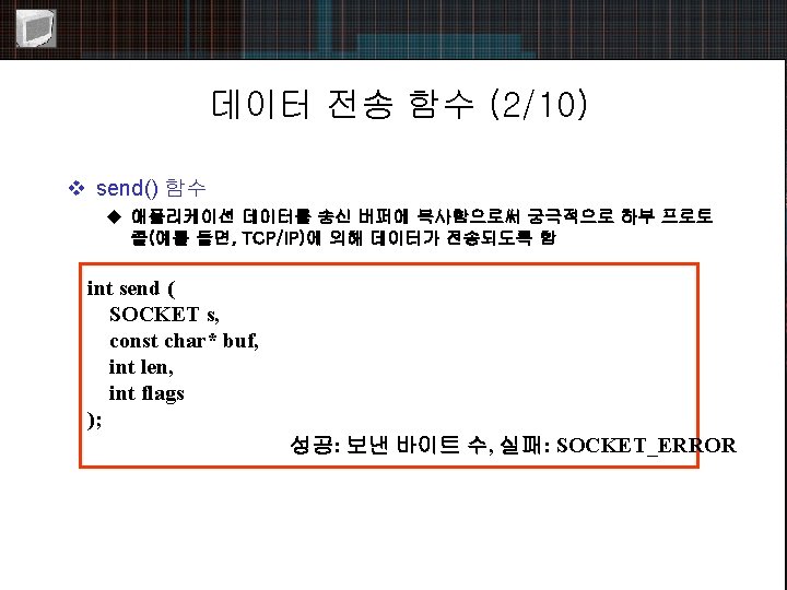 데이터 전송 함수 (6/10) v 데이터 전송 함수 사용 예 – TCP 클라이언트 078 079. . . 082 083 084 085 086 087 088 089 090 091 092 093 094 char buf[BUFSIZE+1]; int len; while(1){ // 데이터 입력 Zero. Memory(buf, sizeof(buf)); printf("n[보낼 데이터] "); if(fgets(buf, BUFSIZE+1, stdin) == NULL) break; // 'n' 문자 제거 len = strlen(buf); if(buf[len-1] == 'n') buf[len-1] = '